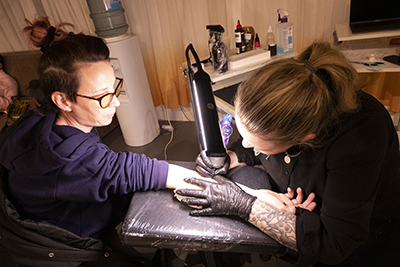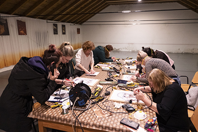 Kroz uvodno predavanje i razgovor, polaznici su se upoznali s konceptom radionice te simbolikom tetovaže u suvremenoj kulturi – identitetom, pripadnošću i otporom. Anita Bartulović predstavila je svoj umjetnički proces u kojem materijalnost metala i trajnost tetovaže postaju polazište za osobni i kolektivni izraz. Praktični dio radionice bio je posebno dinamičan. Sudionici su radili s bakrenom žicom koristeći različite tehnike – savijanje, pletenje, spajanje i oblikovanje – stvarajući apstraktne i figurativne skulpture. Paralelno su iscrtavani motivi mini tetovaža, koji su poslužili kao poticaj za razgovor o osobnim simbolima i značenjima. Sudionici su kući ponijeli dvostruku uspomenu: vlastitu bakrenu skulpturu i mini tetovažu, kao trag procesa u kojem su se isprepleli materijal, ideja i osobna priča.